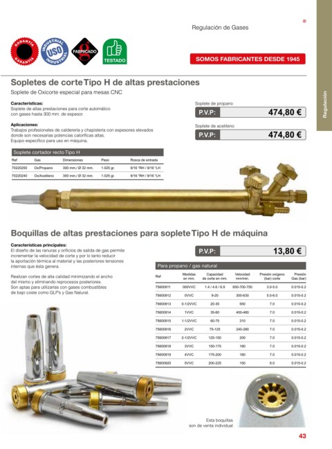 Boquillas de altas prestaciones para soplete Tipo H de máquina